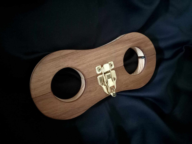 Un petit peu de contrainte avec cette paire de menottes, âme en sapin du jura et plaquage épais en noyer, fermoir cadenassable.